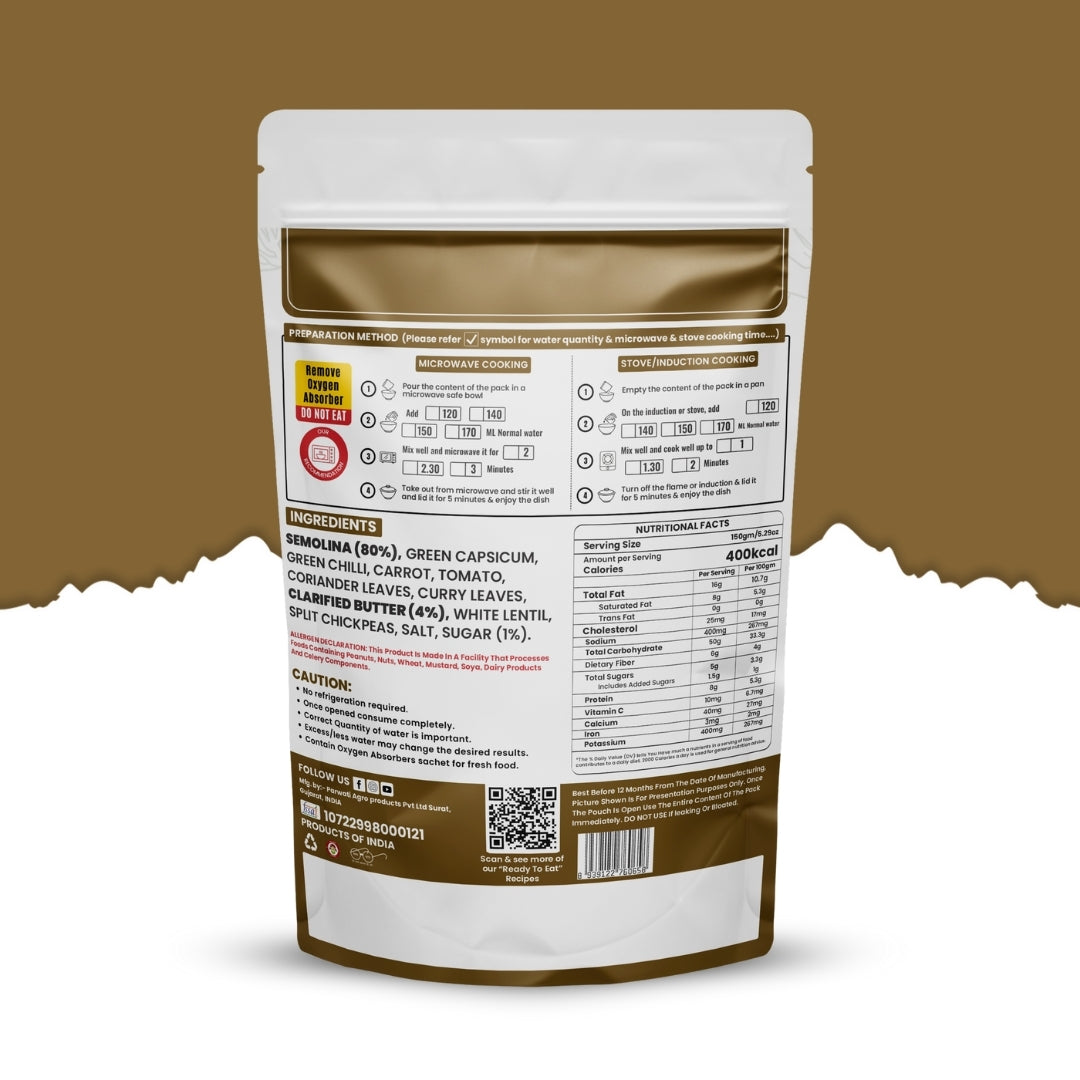 SEMOLINA, MUSTARD SEEDS, CUMIN SEEDS, TURMERIC, CURD, SALT, WATER, GREEN CHILLI, SUNFLOWER OIL, DESI COW GHEE, CURRY LEAVES, CORIANDER LEAVES, TOMATO, GREEN PEAS, CARROT.