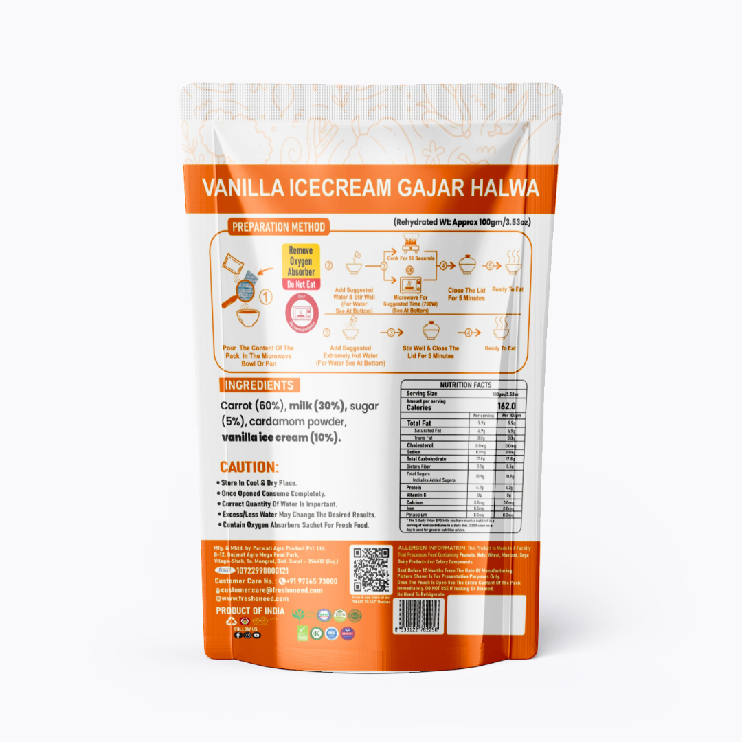 Freshoneed’s Vanilla Gajar Halwa is a delicious take on the iconic carrot dessert, made richer with real milk and a touch of vanilla ice cream that melts into the halwa, enhancing its flavor and texture. Whether it's a festive moment or a sweet craving, this halwa is a spoonful of indulgence in every bite.