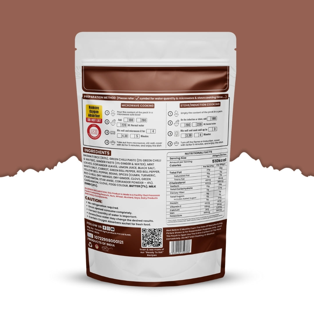 BASMATI RICE, CAUIFLOWER, CARROT, FRENCH BEANS, GREEN PEAS, BROCCOLI, MINT LEAVES, CORIANDER LEAVES,BABY CORN, CURD, SUNFLOWER OIL, SALT, BLACK SALT, INDIAN SPICES, DESI COW GHEE, CARDAMOM POWDER, FOOD COLOUR ( FOR SEASONING ), GREEN CHILLI, WATER
